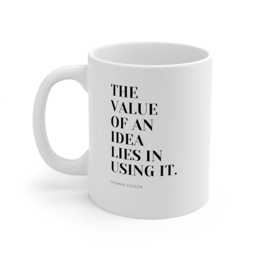 "The Value Of An Idea Is Using It" will keep you inspired on achieving your ideas. This is a a classic bestseller, this custom mug is for those who truly believe there’s nothing better than a cup of your favorite beverage in hand. The mug is made of white, durable ceramic and comes in 11oz size. Place a witty and eye-catching design to make it the perfect gift for every true coffee or tea lover.